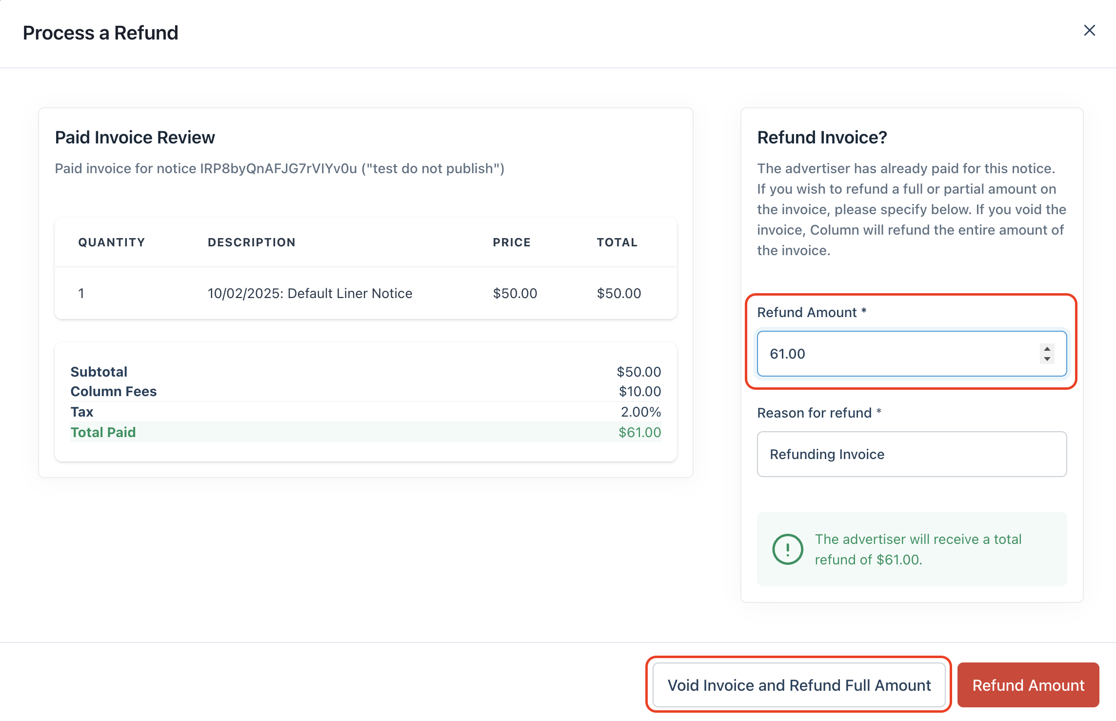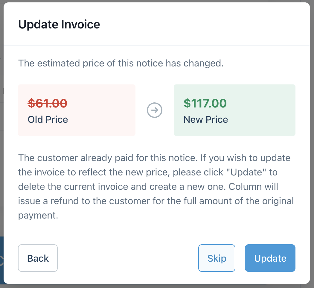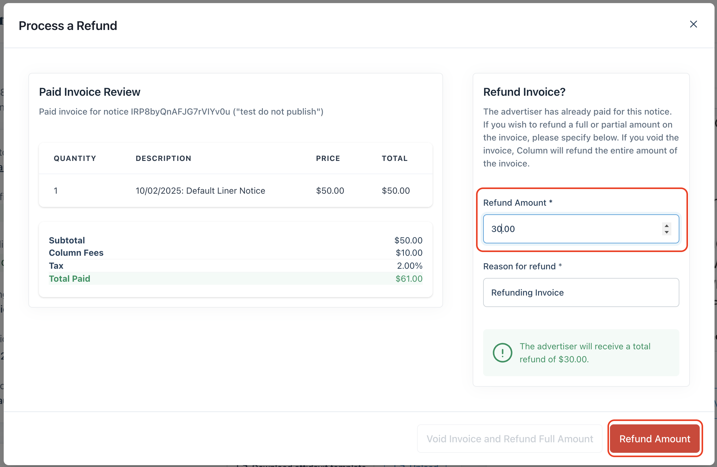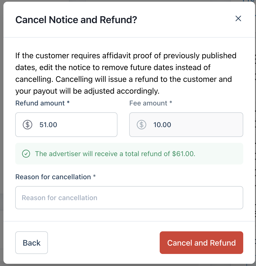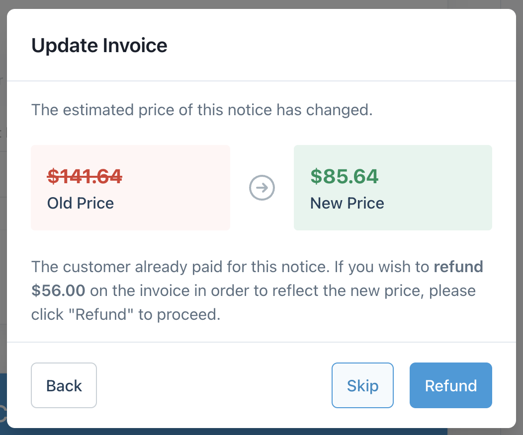 When a notice edit results in the price of the notice changing, you will have the option to issue the customer a refund.