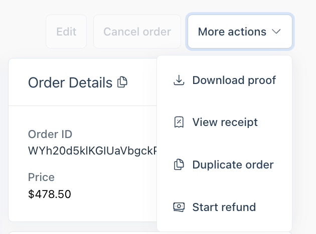 You can refund an obituary or classified order if it was paid by Credit Card. To do so, open the More Details menu and select Start Refund.