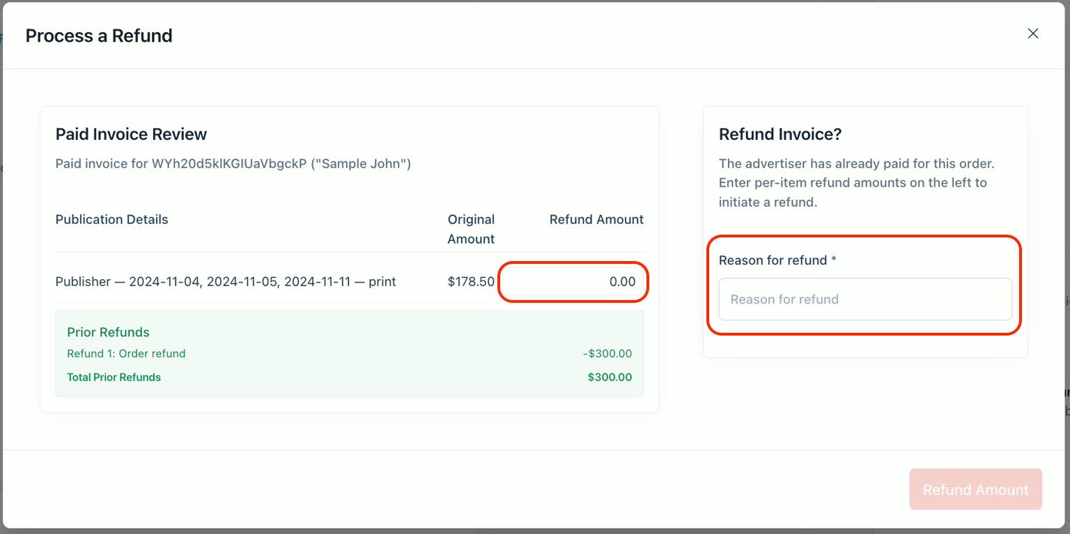 Enter the amount you'd like to refund and a reason, and select Refund Amount