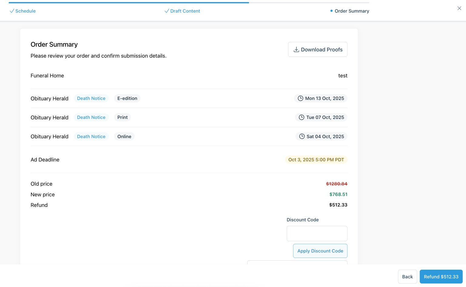 Edits made in the middle of an obituary run that adjust the cost of the order will result in the customer receiving a full or partial refund of the order. When saving changes that change notice cost (such as adding or removing publication dates), you will see the new price in green, and the refund amount in black.