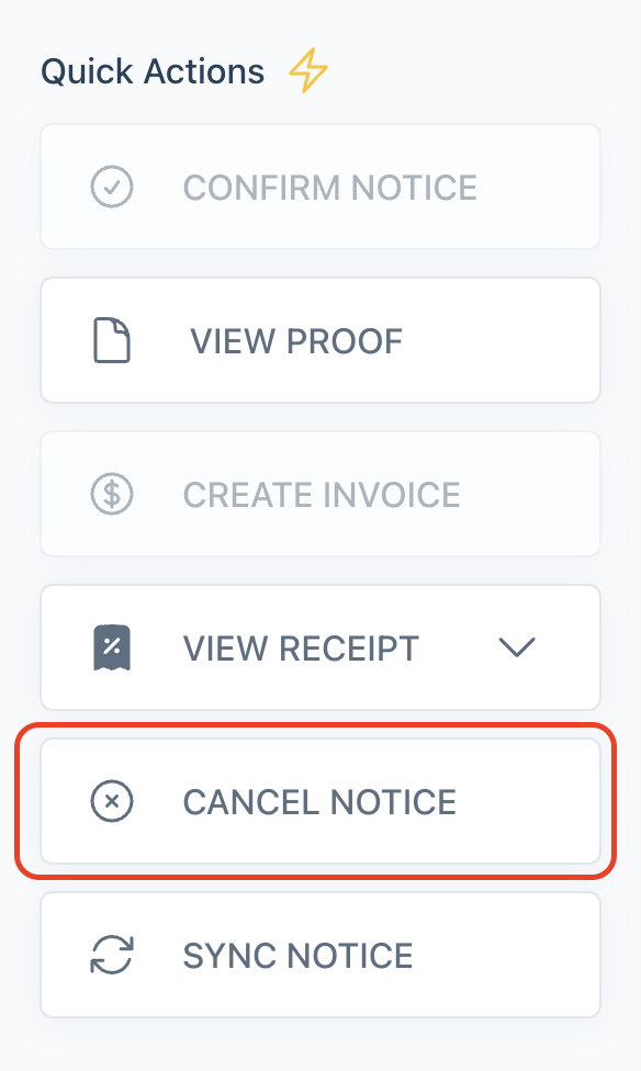 In the Notice Detail page, you can find "Cancel Notice" in the Quick Actions menu: