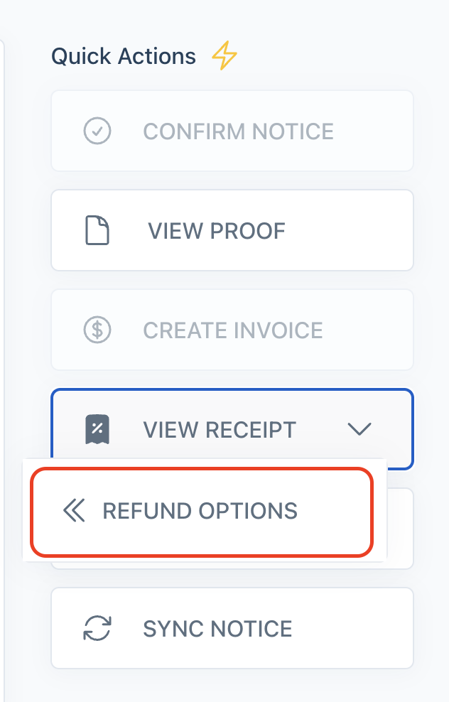 You may want to refund a customer without making any changes to the notice for various reasons — for example, if they pay with the wrong payment method, or if you'd like to adjust the invoice total. In this case, you can select the "Refund Options" from the dropdown of the customer receipt: