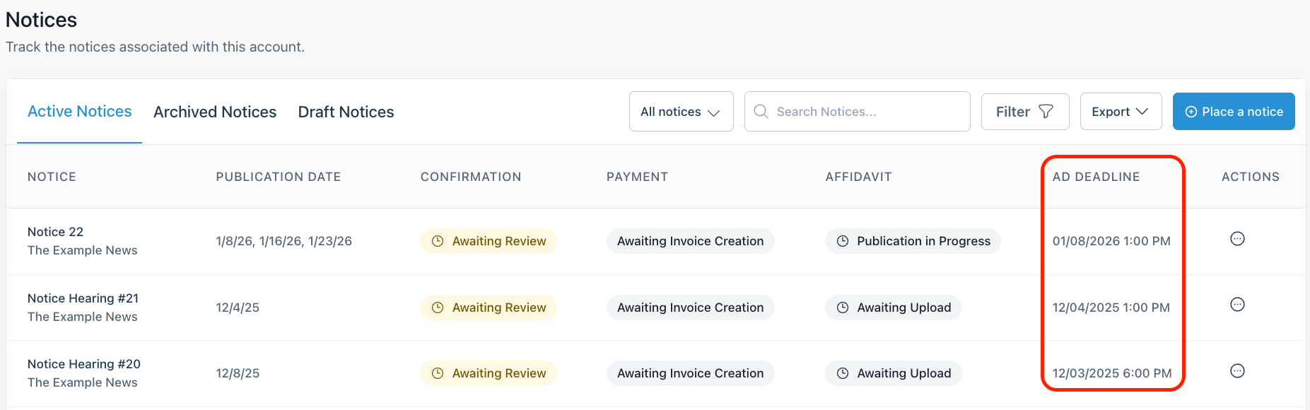 Once a notice has been submitted for publication, the deadline is visible on your Dashboard when you are logged into Column. If you look under the "Ad Deadline" column, you can review the deadline for any notice submitted under your account.