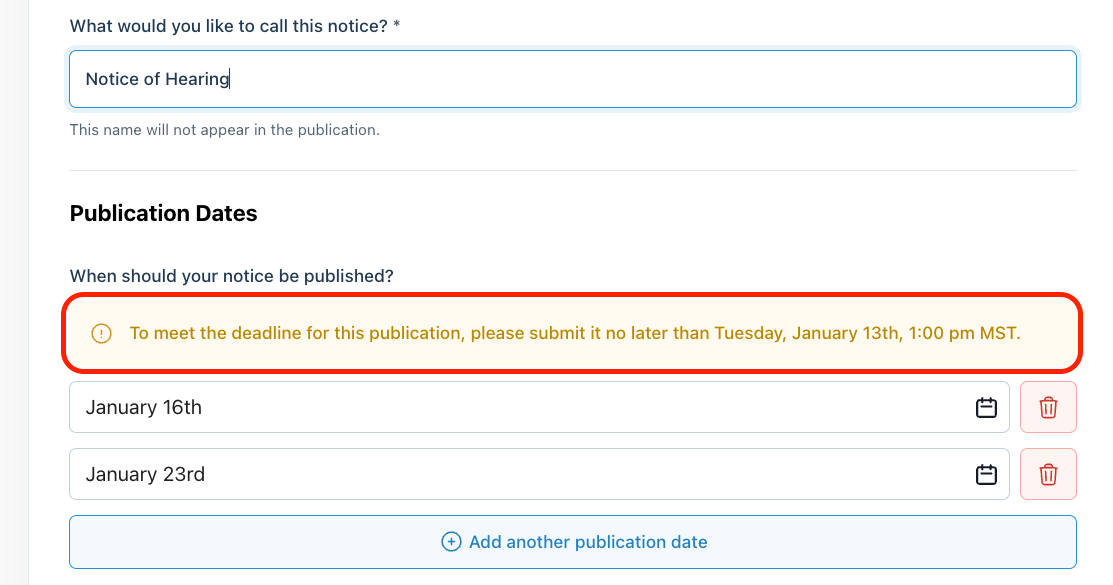 You can review the deadlines for your selected newspaper during the notice placement process. Column will default the publication of your notice to the next available publication date. The deadline for the first publication date chosen will be highlighted in yellow just above the date.